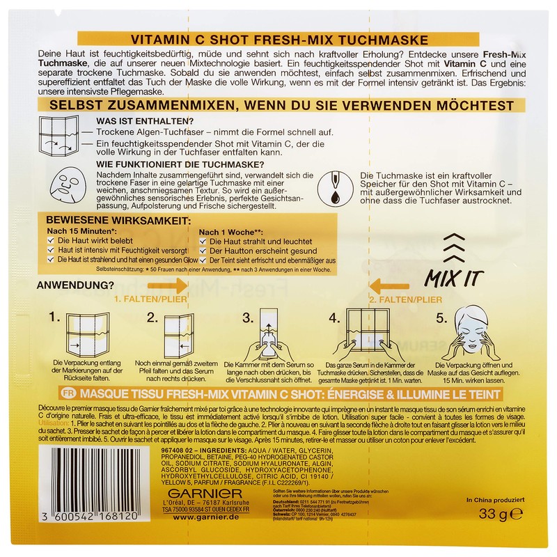Garnier SkinActive Cloth Mask, Vitamin C Shot, Invigorates the Skin, Provides More Radiance, Pack of 3 (3 x 33 g)