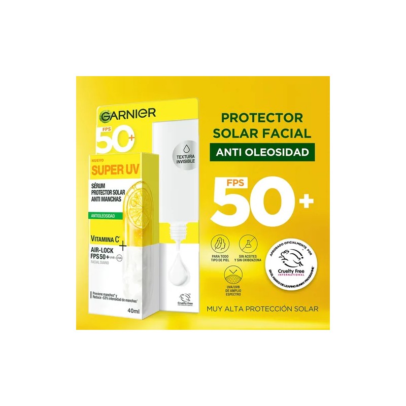 Garnier Super UV Protector Solar Facial Fluido Anti oleosidad FPS50+ con Vitamina C 40ml protege del daño solar y reduce manchas textura ligera aprobado por dermatólogos