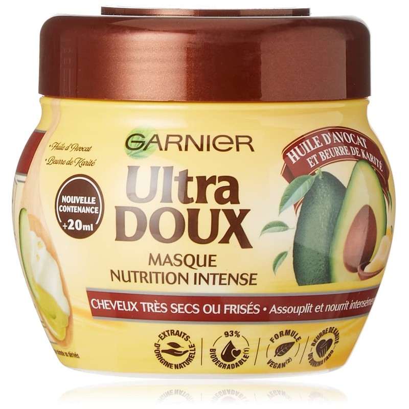- Garnier Ultra Soft nutrient mask with avocado oil and shea butter for very dry or frizzy hair.