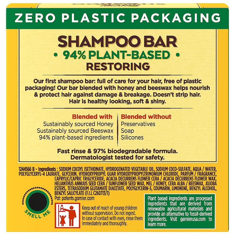 Garnier Whole Blends Honey Treasures Restoring Shampoo Bar for Dry, Damaged Hair, Zero Plastic Packaging, Free of Preservatives, Silicones, Soap, & Dyes, with Sustainably Sourced Honey & Beeswax, 2 Oz