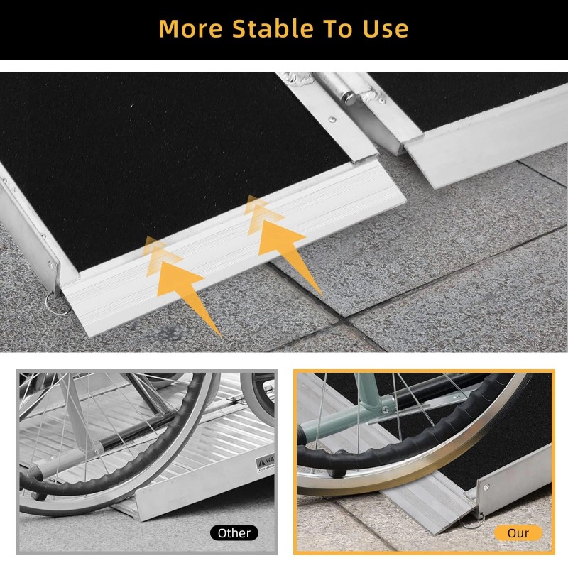 Non-Slip Safety System: The diamond-tread surface + anti-skid coating boosts friction for secure use. Use included grip screws to permanently fix the portable wheelchair ramp to wooden/concrete steps.