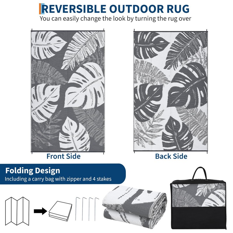 - 【Monstera Leaf Inspired Reversible Design】 Immerse yourself in the tranquil beauty of nature with the reversible outdoor rug featuring a captivating double-sided pattern adorned with a multitude of monstera leaves. The harmonious blend of two shades of grey and white creates a stunning fusion, ensuring that each side seamlessly complements its surroundings for a full and inviting look