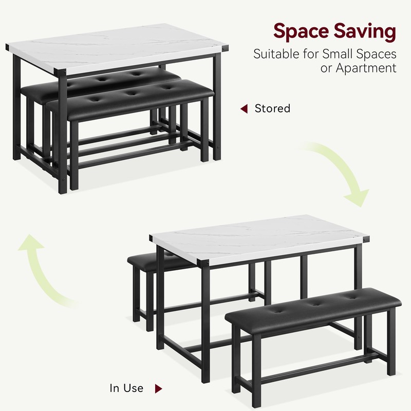 - Space-saving Design:This space-saving solution features two kitchen benches that can be neatly tucked under the kitchen table when not in use, helping to maintain a clean and organized look. It's particularly ideal for compact living spaces like condos, studio apartments, or small kitchens.
