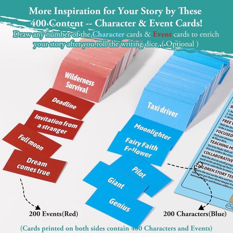 - Creativity Writing Dice: Characters & Events Expansion Pack Set: Includes 9 writing dice, 6 categories of writing elements, covering Who, When, Where, What, and Why. Expansion Pack: 13 writing skill cards and 200 character & events cards. Newly upgraded grammar basics cards ensure accuracy and clarity in your writing - (Updated on: July 1, 2024). Tons of writing ideas await you! Say goodbye to writer's blocks, every time you roll is an enthralling story
