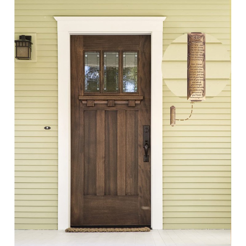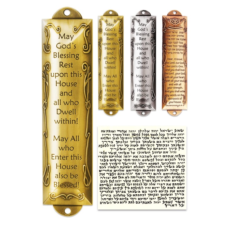 - Mezuzah with Scroll for Door: Three big and very impressive Mezuzahs, made of brass, bronze, and pewter, each includes two mounting screws. The Mezuzahs are ready to be installed on the door frame, It is customary upon entering or leaving a residence to touch the mezuzah. On the Mezuzah there's an engraved blessing in English that blesses the residents and everybody that comes in or leaves the house. To show all guests and whoever my deliver a package. That the Lord's love is forever!!
