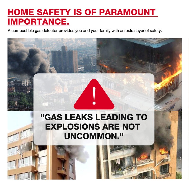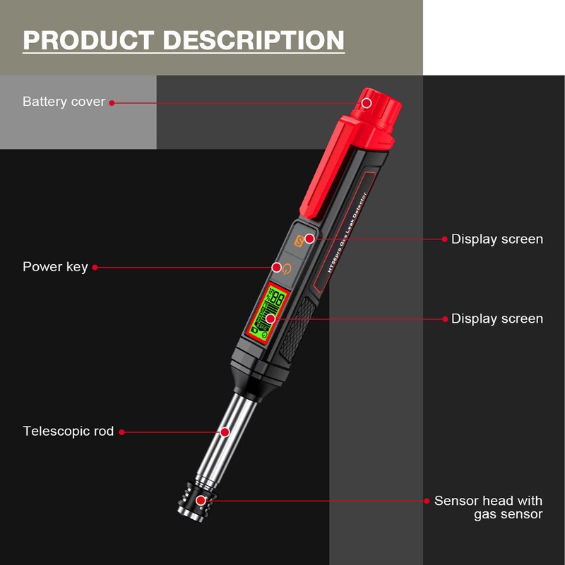 1、[Wide Detection Range] The gas leak detector detects a wide range of combustible gases, ensuring safety in residential, commercial, and industrial environments. 2、[LCD Backlit Display] The gas detector features a large LCD screen and backlit display for easy operation and reading, provides efficient feedback with analog bar, buzzer, and vibration. 3、[Sensitive and Reliable] The gas tester quickly detects gas leaks with a sensitive semiconductor sensor, accurately identifying concentrations for prompt response. 4、[Immediate Alert System] The combustible gas analyzer notifies users with display indications and an escalating alarm, enabling quick action. 5、[Portable Design] The lightweight and sturdy ABS material used in gas detector ensures easy handling and transport. With a clip design, easily clip it on your pocket for carrying.
