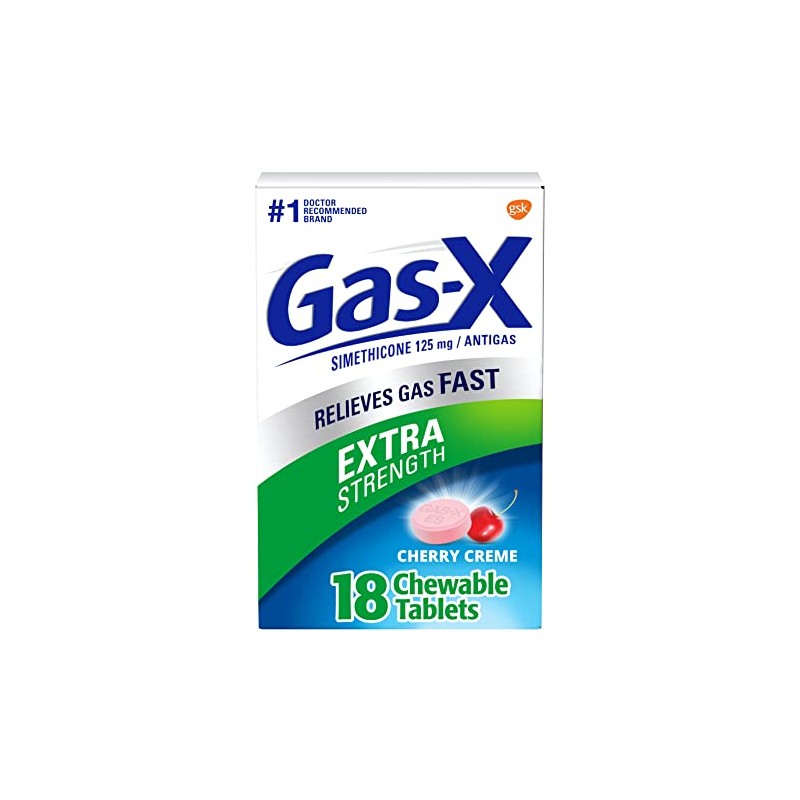 - One package of 18 cherry flavored Gas-X Extra Strength Chewable Gas Relief Tablets with Simethicone 125 mg