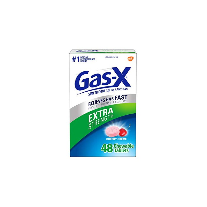 - One package of 48 cherry flavored Gas-X Extra Strength Chewable Gas Relief Tablets with Simethicone 125 mg
