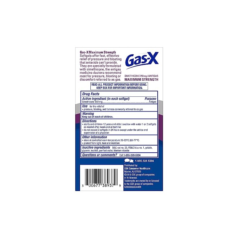 From the number 1 Anti-Gas Relief Brand comes Gas-X Maximum Strength Gas Relief Softgels with Simethicone 250 mg deliver fast relief of gas pressure, bloating and discomfort. These maximum strength simethicone softgels go to work in minutes, rescuing you from embarrassing situations and helping you get back to feeling like yourself. Gas-X uses 250 mg simethicone to break up gas bubbles in your stomach and intestines. Once this trapped gas is broken down, your body can deal with the gas naturally. These fast gas relief pills come in convenient softgels, making them portable and easy to swallow. Adults and children 12 years of age and older may take one or two simethicone 250 mg softgels as needed, not to exceed two softgels in 24 hours unless directed by a doctor. Gas-X is the name you turn to when you need serious gas relief. Trust Gas-X, the number 1 doctor recommended OTC anti-gas product. (1) (1) ProVoice Survey fielded from March 1, 2020 to February 28, 2021, and recording recommendations for OTC Anti-Gas products
