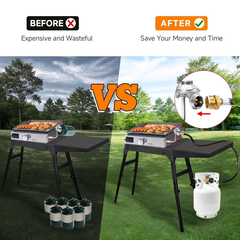 • 【Compatible with 1 lb Portable Grill】:1lb to 20lb propane hose is compatible with all 1-pound portable devices, suitable for Weber Q grills, Coleman camping stoves, Blackstone 17" and 22" griddles, Buddy heaters, and more. You can reduce costs and minimize any waste associated with 1lb propane cylinders