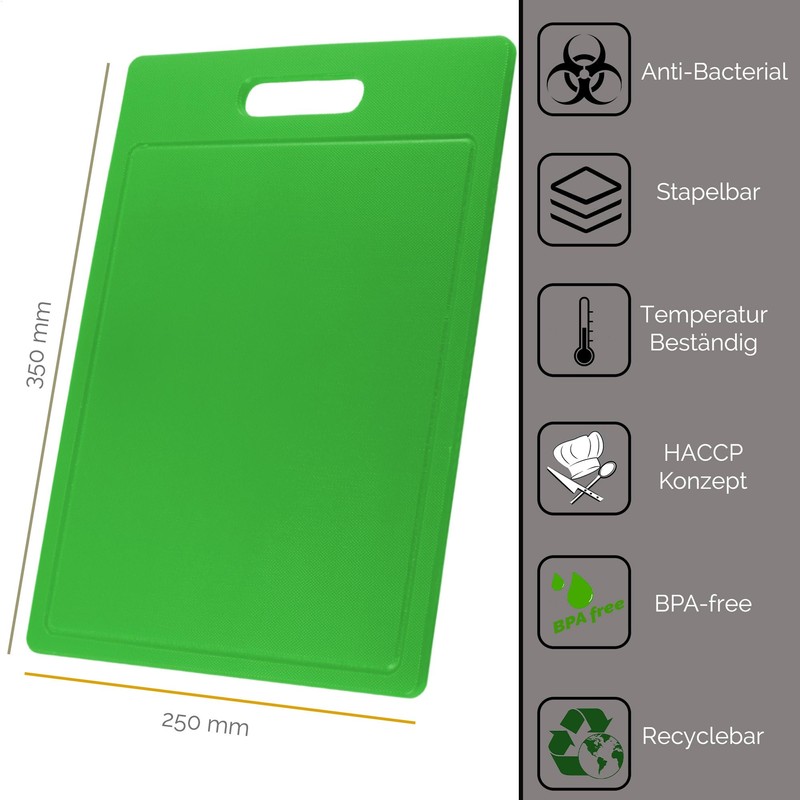 Unter hygienischen Gesichtspunkten ist die Nutzung von unterschiedlichen Schneidebretter für verschiedene Lebensmittelgruppen äußerst empfehlenswert - dank der Farbvarianten ist eine hygienische Trennung der Lebensmittel ganz einfach.