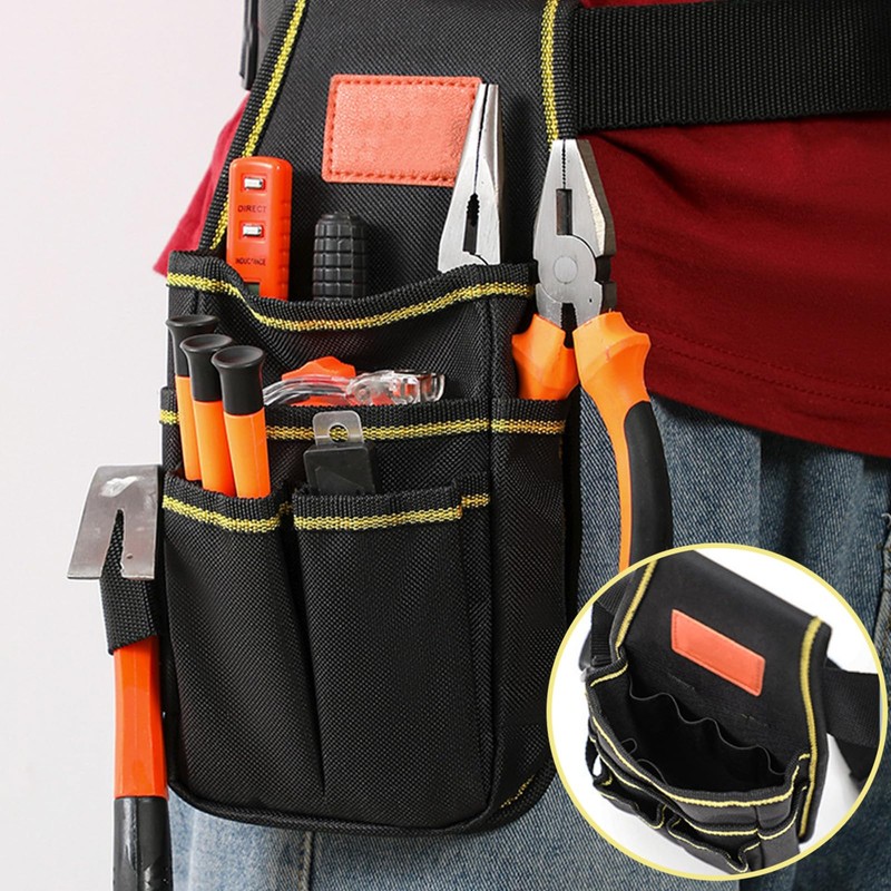 - MULTIPLE COMPARTMENTS The tool storage waist bag features a large compartment, a small front pocket and a small side pocket. It provides ample storage space for hammer, wrench, tape measure, screwdriver, pliers and other tools. With this waist bag, maintenance personnel no longer have to bend over as frequently during repairs, which increases work efficiency.
