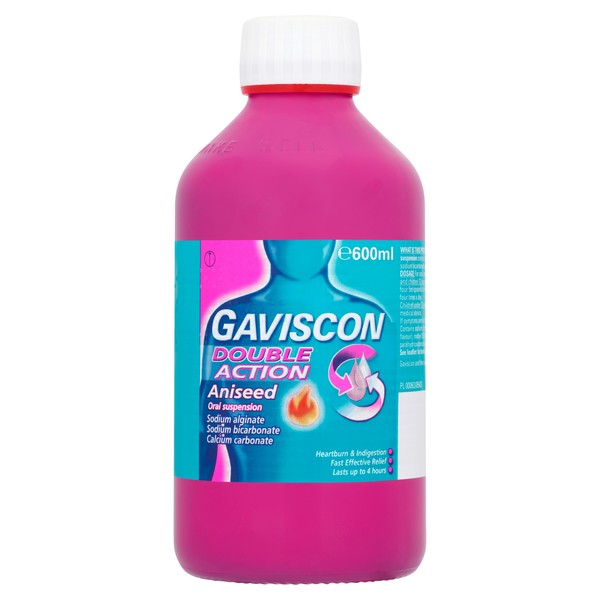 - Gets to Work Instantly - Gaviscon Double Action's formulation gets to work in seconds to create a protective barrier that lasts up to 4 hours. In fact, 9 out 10 people would use Gaviscon Double Action again (based on a survey of 45 heartburn and indigestion sufferers compared to control. - Lasts up To 2 X Longer than Antacids - Unlike antacids, Gaviscon Double Action forms a raft, or layer, on the top of your stomach contents and to help keep stomach acid in your stomach, where it belongs. - Unique Formulation/combination for Dual Relief of Heartburn & Indigestion - Gaviscon Double Action neutralises excess stomach acid to help relieve discomfort. It also forms a protective barrier over the stomach contents to help soothe the burning sensation in your chest. - Suitable for Use in Pregnancy - Gaviscon products are suitable for use during pregnancy and whilst breastfeeding. Medicines can harm your unborn child, Always speak to doctor or pharmacist before using medicine in pregnancy. - 40 Years of Gaviscon - For over 40 years, Gaviscon has helped to provide millions of people with fast, effective heartburn and indigestion relief. Gaviscon Double Action Aniseed Liquid bring fast, soothing and long lasting relief for up to 4 hours from heartburn and indigestion. They get to work in two different ways: Neutralising excess stomach acid to help relieve discomfort. Forming a protective barrier over the stomach contents to help soothe burning sensation in your chest so, for symptoms of heartburn or indigestion Gaviscon double action can help provide fast, soothing relief. The tablets do not contain sugar or gluten. You can take this product if you are pregnant or breast-feeding. Gaviscon Double Action liquid for heartburn and indigestion. Medicines can affect the unborn baby. Always talk to your doctor or pharmacist before taking any medicine during pregnancy. If symptoms are severe or prolonged you should consult a doctor or pharmacist. Always read the label. RB-M-30605