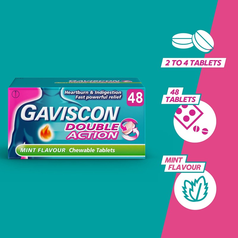 Gaviscon Double Action Mint Tablets bring fast, soothing and long lasting relief from heartburn and indigestion. They get to work in two different ways: Neutralising excess stomach acid to help relieve discomfort (white layer) Forming a protective barrier over the stomach contents to help soothe burning sensation in your chest (pink layer)