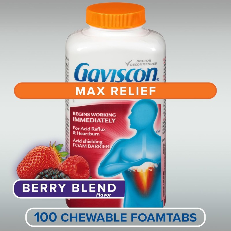 Gaviscon Max Relief Tablets - 100 Count - Chewable Foaming Antacid Tablets for Day and Night Heartburn Relief, Acid Reflux and GERD Relief, Berry Blend - Free of Aluminum, Lactose and Gluten