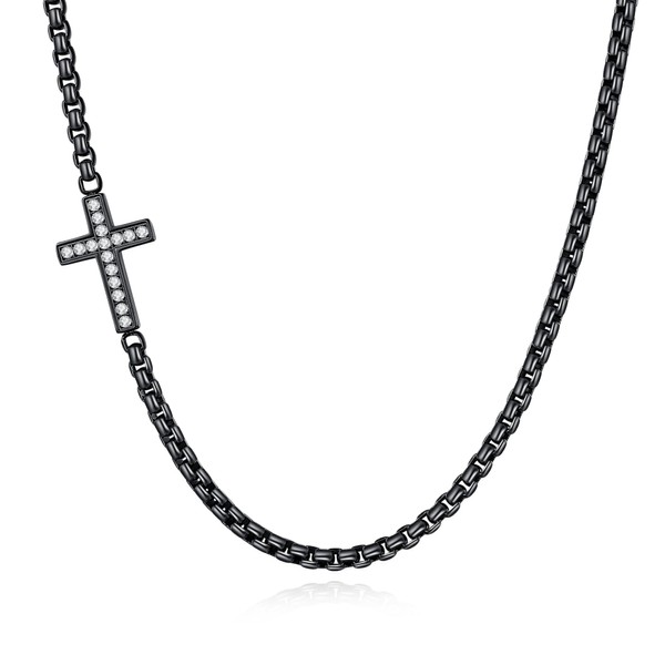 - This men's stainless steel necklace features a 23*14mm black CZ paved cross charm set in 4mm black box chain, finished with lobster clasp, length in 60cm