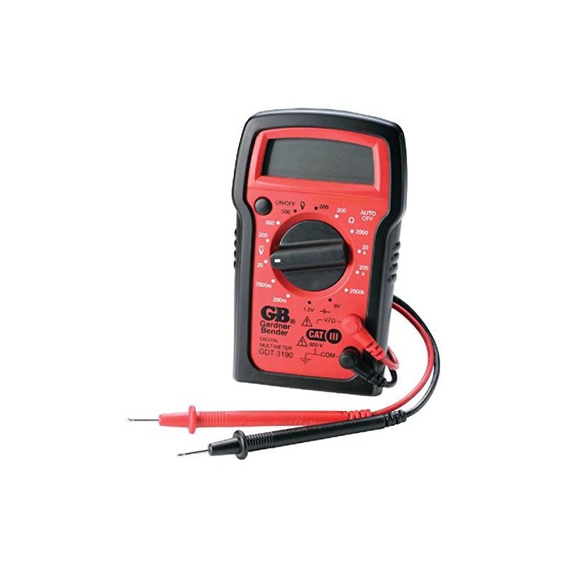 When you're ready to add a multi-meter to your toolbox this unit is an excellent choice. Designed to work on most household appliances and equipped with an easy-to-read 3.5 inch digital display this Gardner Bender multimeter features rubber housing to promote a steadfast comfortable grip. Engineered with four testing functions; AC Voltage to 500V, DC Voltage to 600V, Resistance to 2 meg Ohms and Battery Testing for 1.5V, 9V and 12V batteries. The 16 position manual ranging smooth rotary dial helps achieve precise and accurate readings and the low battery indicator with auto-off function helps prolong the battery life. The durable housing with a rubber boot is not only drop resistant to 6 ft. and crush rated to 150 lbs but also features wrap-around lead holders. Snap-in probes are spaced to fit a standard outlet for quick and easy testing. Tight and secure input jacks keep the included 26" test leads fixed firmly in place during testing. The unit comes pre-packaged with leads. Tester is rated CAT III 600V and conforms to UL 61010-1 standards and certified to CAN/CSA C22.2. (Requires 9V battery - not included).; ; Brand Name: Gardner Bender Test Range: 500/600 V Display Type: Digital Product Type: Multimeter Number in Package: 1 pk Width: 2.8 in. Automatic Ranging: No Color: Black/Red Automatic Delay Shutoff: Yes Packaging Type: Carded Battery Size: 9-Volt Batteries Included: No Height: 5.75 in.