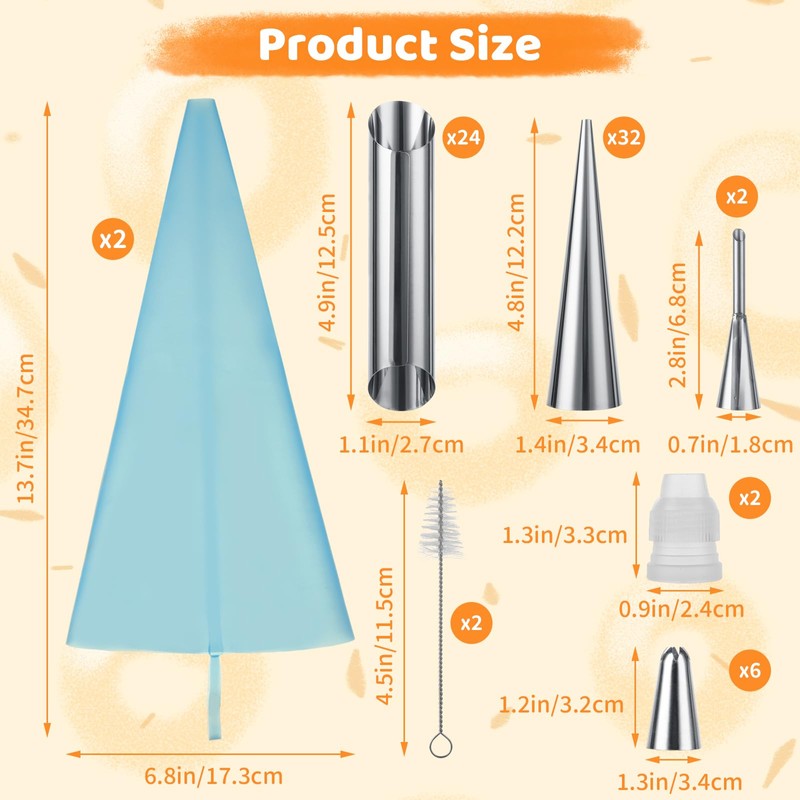 - PACKAGE INCLUDES - Cannoli Forms Tubes Kits includes 32 pointed cylinder molds, 24 double-ended molds, 6 cream spouts, 2 converters, 2 cream bags, 2 squeeze puff sandwich spouts and 2 cleaning brushes. This is a set of bread baking tools that can meet most of your needs.