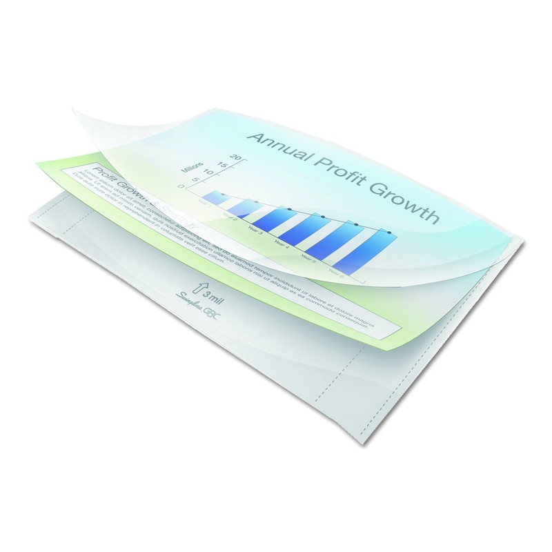 Upgrade to EZUse thermal laminating pouches for faster, error free document lamination. A Fusion EZUse pouch includes 3 features that are specifically designed to make it easier to laminate. First, alignment guides on the pouch help you to perfectly center your item inside the pouch to get flawlessly even lamination borders. Secondly, a mil thickness icon identifies pouch thickness for proper laminator settings and quality finishing. Third, a directional arrow on the pouch serves as a helpful reminder to always insert the sealed edge first into your laminator to reduce misfeeds and jams. Almost magically, all 3 of these useful features disappear after laminating for picture-perfect and amazingly clear lamination results. Also with UV protection to prevent documents from fading or yellowing over time, your laminated documents preserved in a Fusion EZUse pouch will always display dynamic text and rich colors. EZUse thermal pouches can be used with any laminator, including Swingline GBC Fusion Laminators. Pouches are available in a various mil thickness, pack quantity and document sizes. Letter size Fusion EZUse pouches, in particular, come in both traditional and speed styles. The letter size speed pouches are sealed along the long side which enables them to run through a 12" laminator faster than a standard pouch.