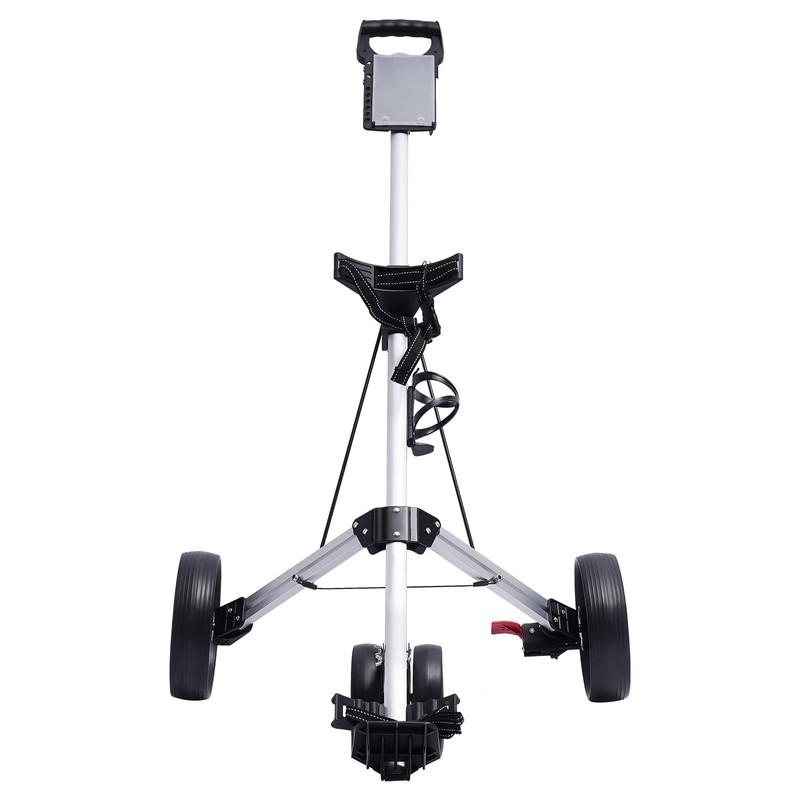 - DURABLE: This golf cart is made of high quality aluminum alloy frame with oxidized finish, strong and durable, triangular support structure, screw reinforcement structure, enlarged wheels (front wheels: 5.9“, rear wheels: 8.85”), and exquisite top and bottom brackets make this cart highly stable and can hold 33-44 lbs. It can hold 33-44 lbs and fits most standard size golf bags.