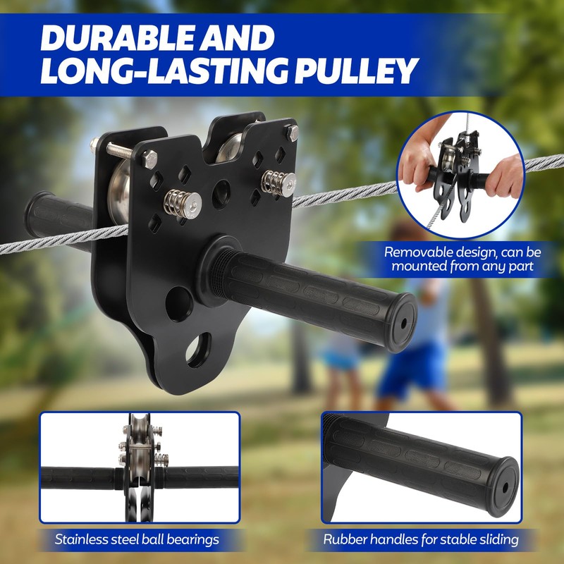 - Removable Upgraded Trolley: The pulley system is constructed from double stainless steel with sealed ball bearings, wear-resistant alloy pulleys, steel side plates, and non-slip rubber grips. Easily removable from the cable via a bottom opening, allowing for convenient installation and maintenance