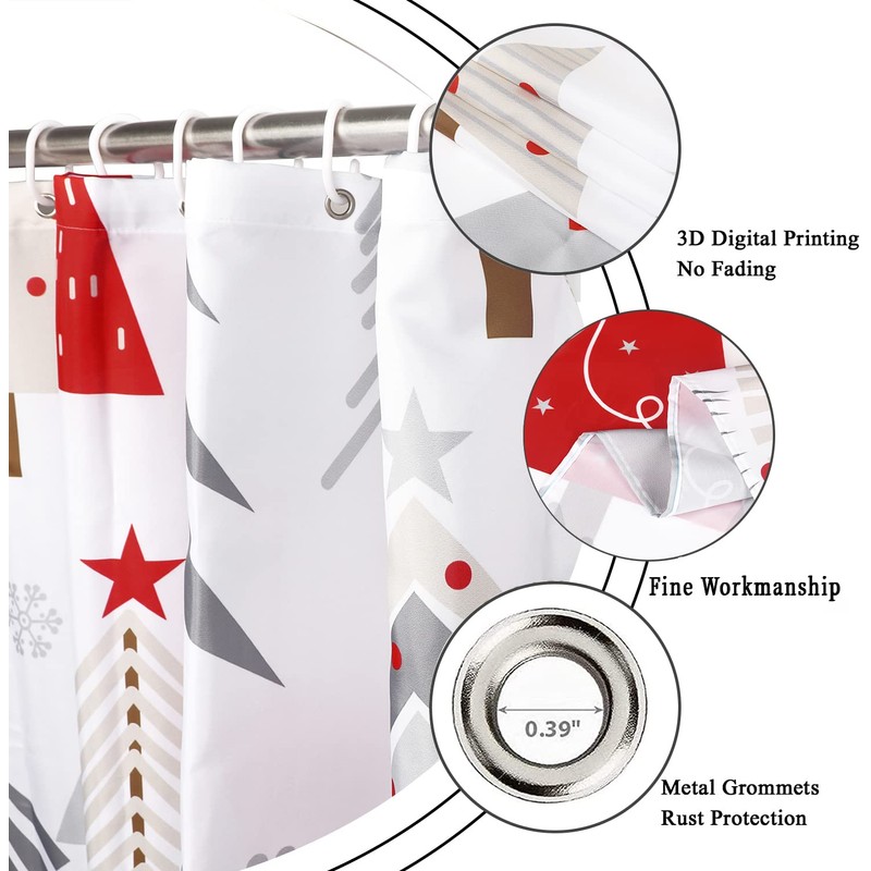- [Install and Disassemble Quickly] There are rustproof metal grommets on the top, it comes with 12 pcs plastic hooks, and the stall shower curtain can be hung on the pole quickly by using curtain rings. This xmas tree shower curtain can be installed and removed easily.