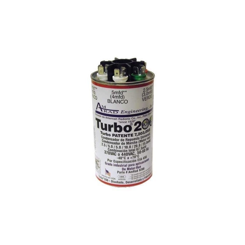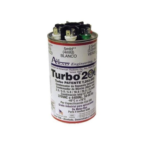 Replace more than 200 different motor-run capacitors // 2.5 to 67.5 MFD, 370VAC or 440VAC // Permanent replacement capacitor // Protected to 10,000 AFC Specification: Description : Turbo200 // Diameter : 2-1/2 // Height : 4-1/2" // Mfd : 2.5 to 67.5 // Volts : 370VAC or 440VAC // : 1.10 / Shipping Width : 5.50 // Shipping Length : 2.90 // Shipping Height : 2.80"