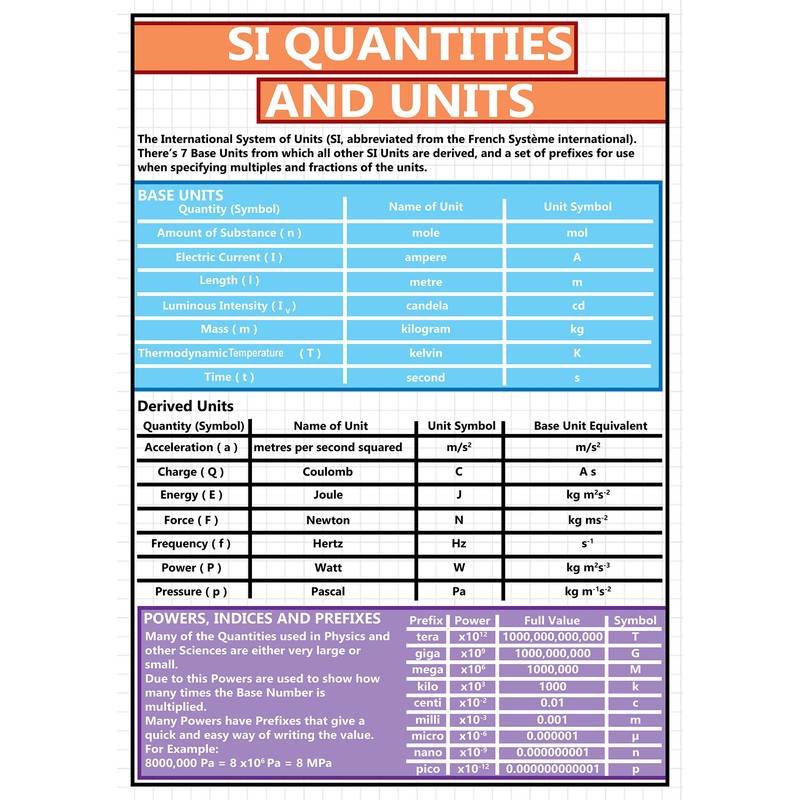 GCSE Science - SI Quantities and Units Physics Information Poster - Teach & Learn, Display, Classroom Decoration - Paper Laminated - A2 Size 42 x 59.4 cm