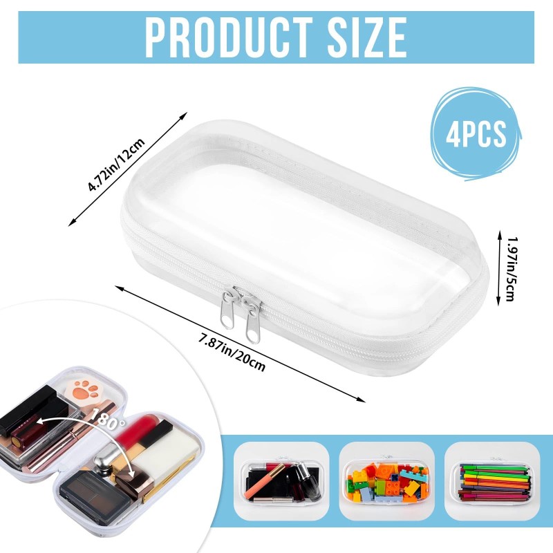 Clear Hard Shell Zipper Case: The size of these clear storage box set with zipper is approximately 7.9 x 4.7 x 2.0 inches. The package includes 4 hard zipper cases, which will give you enough space to store and organize multiple items, making the messy environment clean and tidy