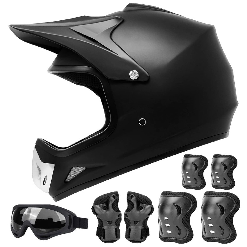 • YOUTH Kids Full Face Motorcycle Helmet for Children plus Goggles With Black Lens + Knee Elbow Wrist Safety Pads