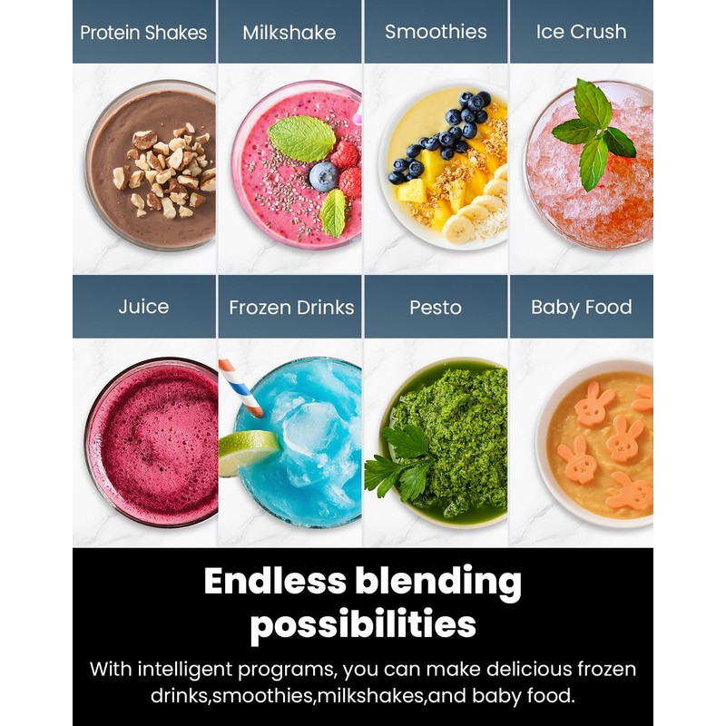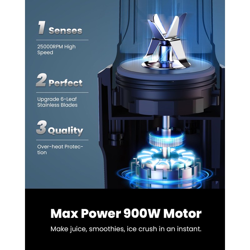 - 25,000 RPM Powerful Smoothie Blender:Equipped with a Max power 900W motor,this smoothie blender reaches speeds of up to 25000RPM for quick and efficient blending. Crush ice cubes and frozen fruits with ease.