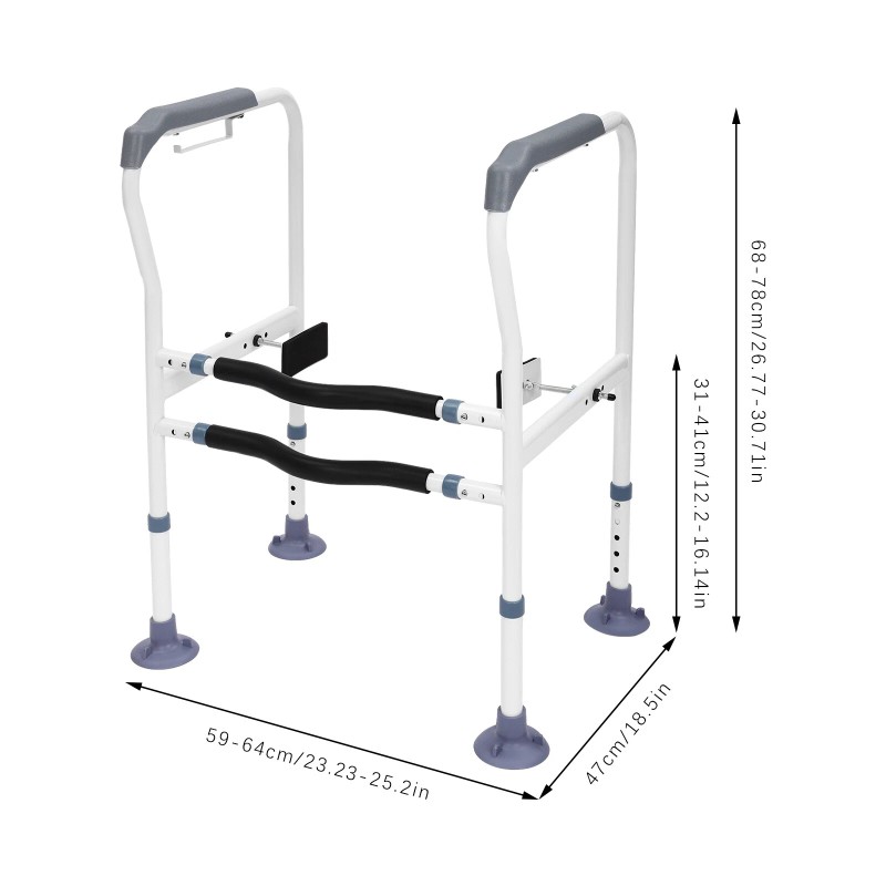 High Flexibility: You can adjust the length of this toilet safety rails between 23.62-25.6in and the height between 25.6-30.71in through holes on the frame, which can provide safety for people of most heights and shapes.