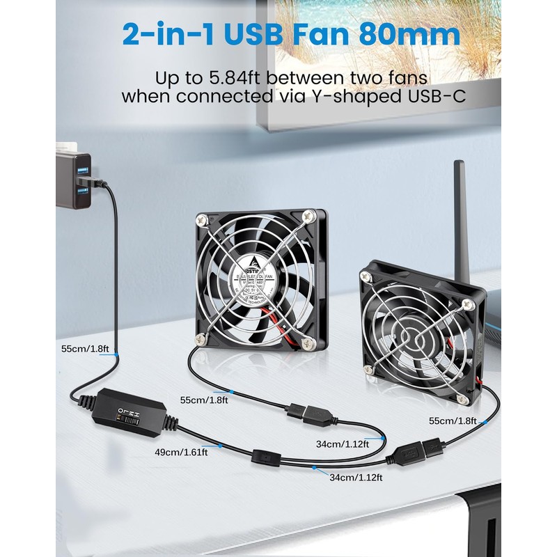 • Versatile Cooling: 2 in 1 dual 80 mm usb fans can cool electronics from different angles at the same time; 15 mm slim design fan fits tight spaces; ideal for solar combiner box, laptop cooler, raspberry Pi, gaming console, modems and routers cooling