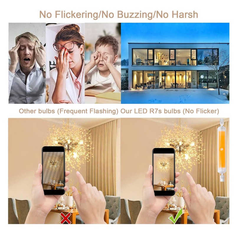 - Eye protection dimmable R7S bulbs: R7S LED 118 mm, which can adjust the light brightness via dimmer. No flickering, protect your eyes and take care of your family. No dangerous emissions, no UV or IR radiation, perfect light source for environmental protection