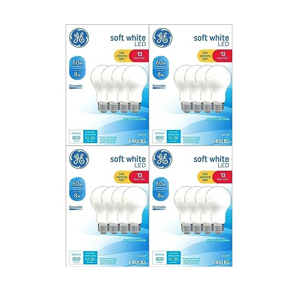 GE 16 Pack LED 60W Equivalent Soft White A19 2700K Light Bulbs, (Soft White, 16 Pack)