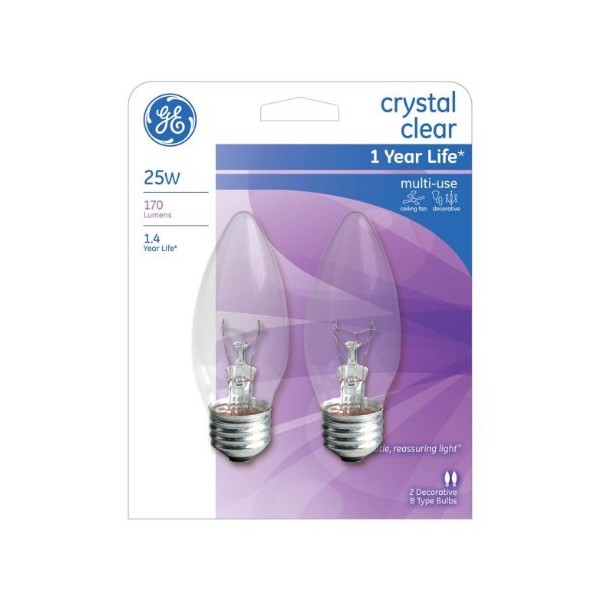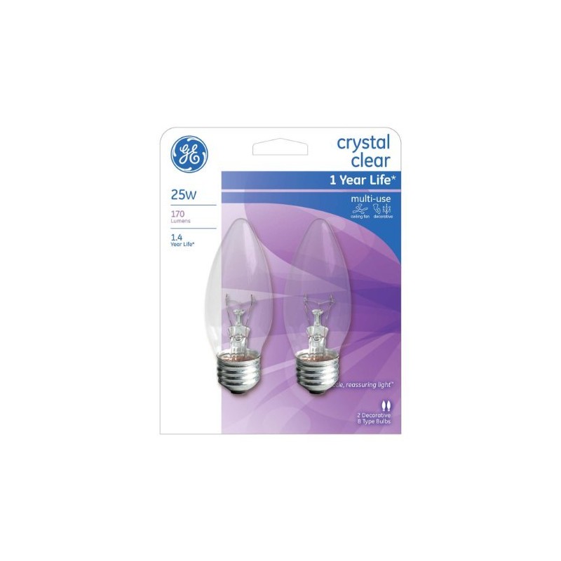 GE 25 Watt B Type Crystal Clear Multi-Use Light Bulbs 170 Lumens 2-Pack - 76384