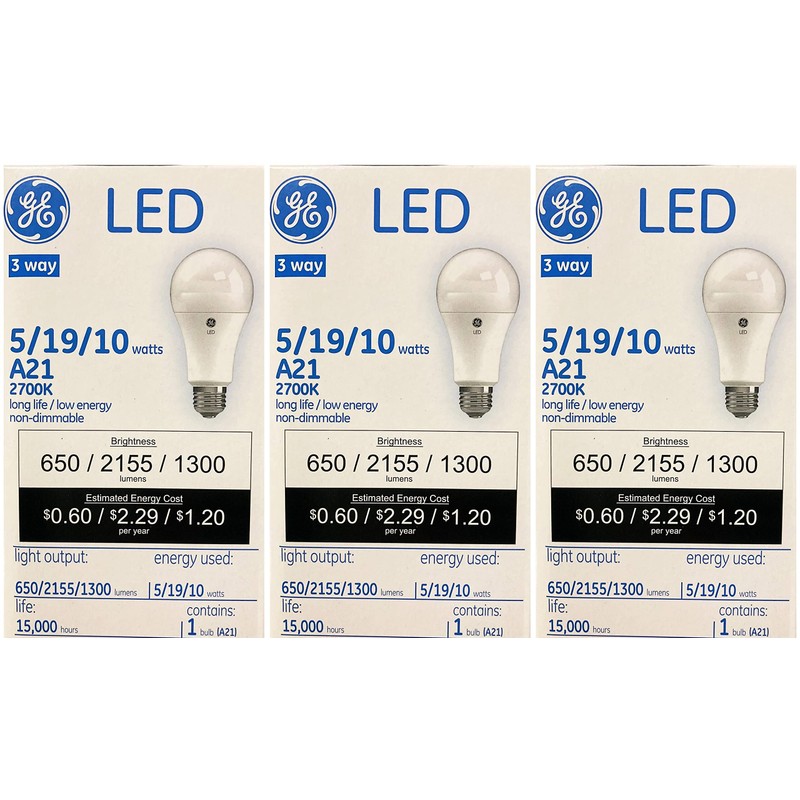 GE (3 Bulbs) 38563 A21 3 Way LED Light Bulb, 5w/19w/10w Classic Shape, LED 3-Way Light Bulb