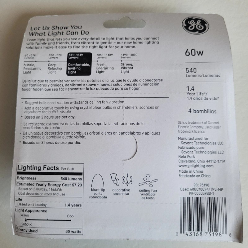 GE 4 GE 60w Decorative B Multi Use Candelabra Base Bulbs Crystal Clear 4PK Bulb