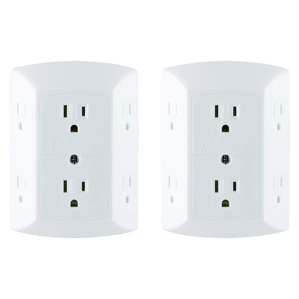 GE 6-Outlet Extender, 2 Pack, Grounded Wall Tap, Adapter Spaced Outlets, 3-Prong, Quick and Easy Install, UL Listed, White, 40222
