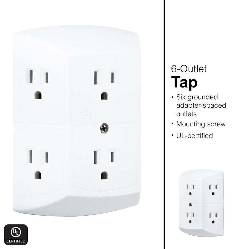 - Save Space – This white outlet tap has three standard outlets and three extra-wide spaced outlets to fit your bulky cell phone chargers or power adapters
