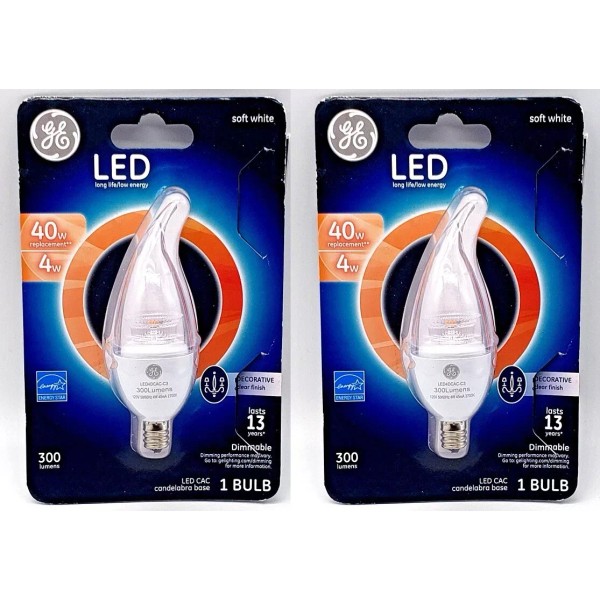 GE Lighting 2 Pack- GE LED Candelabra Bulb 4w Dimmable Bent Tip Soft White 300 Lumens