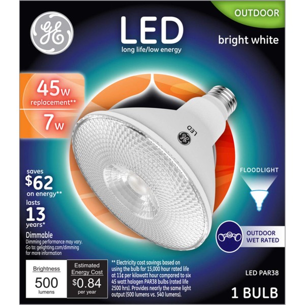 GE Lighting 38460 LED Flood Light Bulb, Bright White, Clear, Par38, 500 Lumens, 7-Watts - Quantity 1