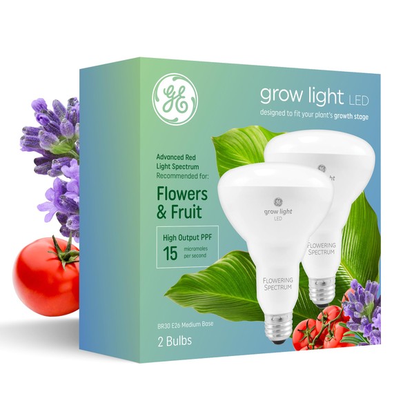 GE Grow Lights for Indoor Plants, BR30 Indoor Floodlight, LED Light Bulbs for Flowers and Fruit, Advanced Red Light Spectrum, 25,000 Hours Lifespan, 15 PPF, 2 Pack (Packaging May Vary)