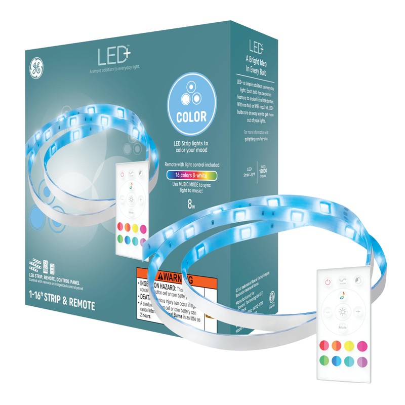 GE LED+ Color Changing LED Light Strip, 8W, Music Syncing Strip Light with Remote, College Dorm Light, Dorm Room Essentials, Bedroom Light, 16ft