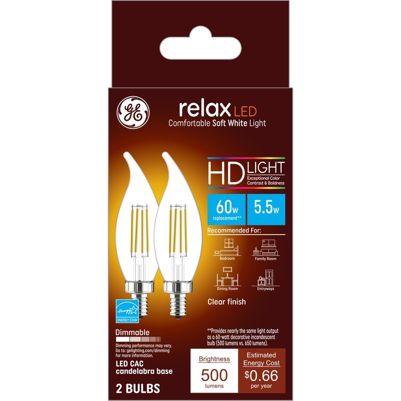 GE Relax LED Light Bulbs, Candle Lights, 60 Watts, Soft White Clear Decorative CA11 Bulbs, Small Base (2 Pack)