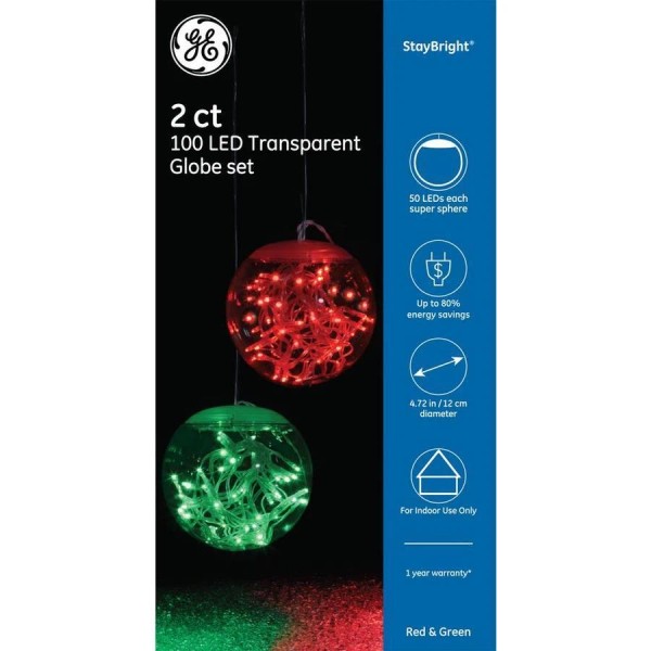 GE StayBright LED 100-light 4.7-in. transparent globe set red and green.