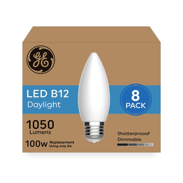 GE Ultra Bright LED Light Bulbs, 100W, Daylight Candle Lights, Frosted Decorative B12 Light Bulbs (8 Pack)