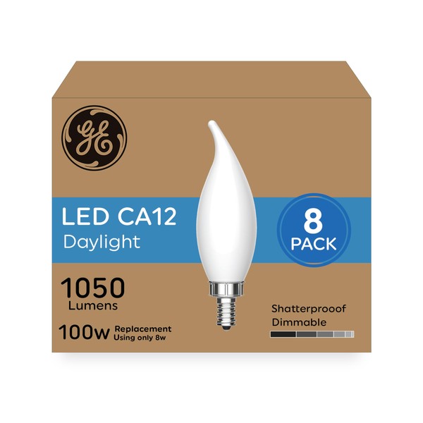 GE Ultra Bright LED Light Bulbs, 100W, Daylight Candle Lights, Frosted Decorative CA12 Light Bulbs, Candelabara Base (8 Pack)