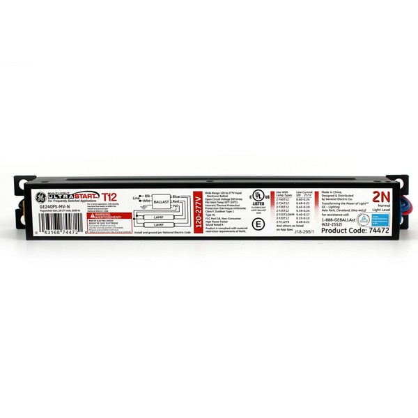 GE 74472 GE240RS-MV-N 120/277-volt Multi-Volt ProLine Electronic Fluorescent T12 Programmed Rapid Start Ballast, 2 or 1 F40 or F34T12 lamps. Programmed Rapid Start T12 Ballast will accept up to 2 or 1 F40 or F34T12 lamps. Accommodates multi-voltages from 120 to 277-volts, extra versatile for your unique projects. High performance rapid start electronic ballast is for all general fluorescent applications. Low profile housing and lightweight for portability. Mounting dimensions: 8.9-Inch L x 1.1-Inch W, Mounting slot set 1.06-Inch apart. Multi-Volt ProLine T12 Electronic Fluorescent ballasts meet the Dept. of Energy minimum ballast efficiency requirements. Multi-volt and dedicated voltage ProLine T12 ballasts may be used to replace existing magnetic T12 electronic ballasts during maintenance or retrofits. Parallel lamp operation keeps the unit maintenance easier to manage, if one lamp fails others will stay on. Unit provides auto-restart functions and thermal protection. T12 ballast sound rating: Class A (20-24 decibels). Ballast factor rating of Normal .87 for full light output, ballast factor rating controls light output and wattages of each lamp, a lower BF will reduce light output and wattage of each lamp, meaning more lamps would be needed to achieve a certain foot-candle level in the same area. UL Type 1 Outdoor, UL Type HL, UL Class P, ETL NRCan, CUL Listed, and ROHS Compliant - Industry standards for safety and performance.