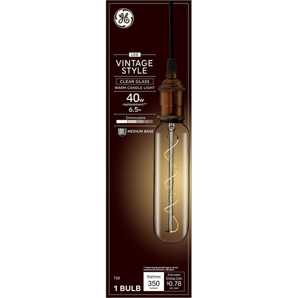 GE Vintage Style LED Light Bulb, 40 Watt, Clear Finish, T20 Tube Light Bulb (1 Pack)
